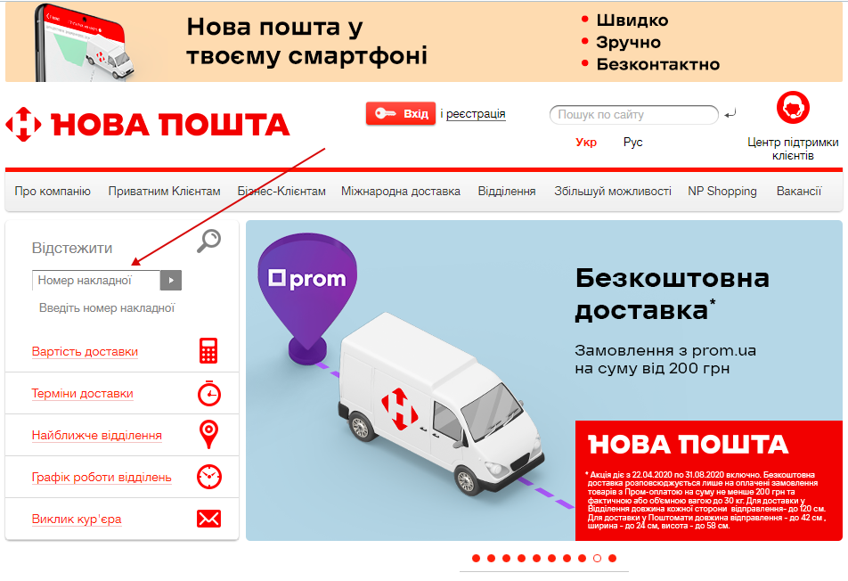 Можна відстежити, де перебуває ваша посилка в конкретний момент. Просто введіть номер накладної на головній сторінці компанії-перевізника - https://novaposhta.ua.